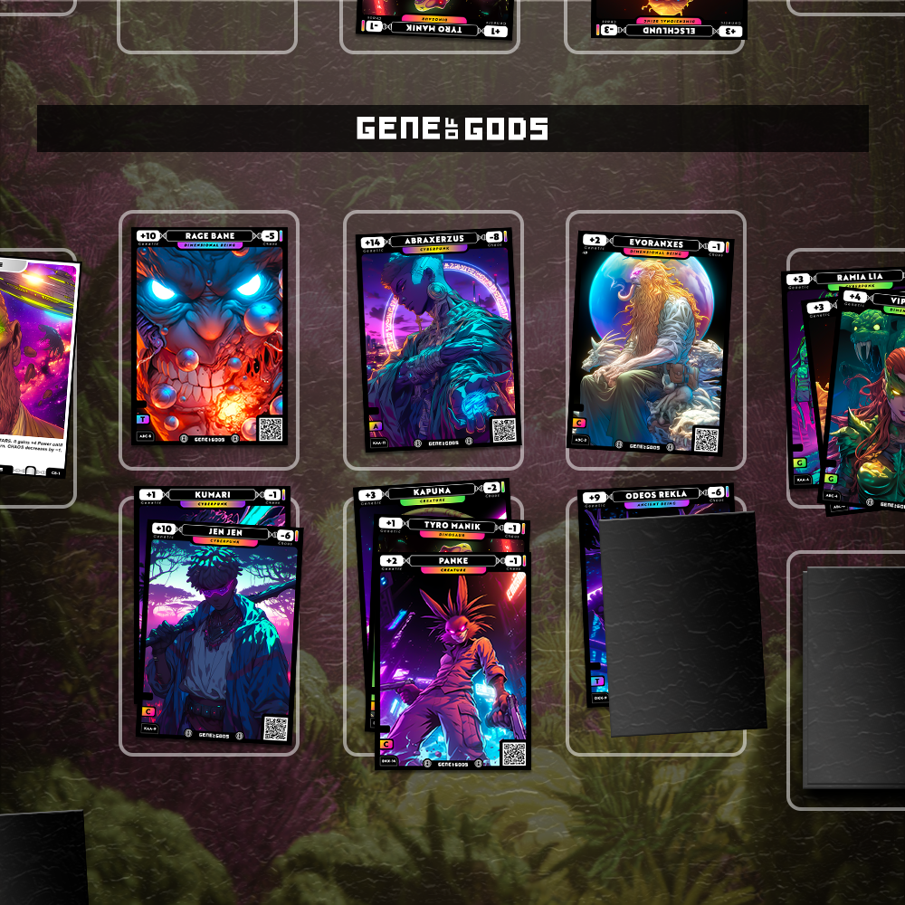 GENE OF GODS is a next-generation, fully digital Print-Yourself TCG that fuses science, mythology and sci-fi into a constantly expanding Multiverse. Every card is a fragment of simulated evolution — every choice reshapes your reality. You don’t just play a game. You step into an infinite experiment of power, mutation, and discovery.
