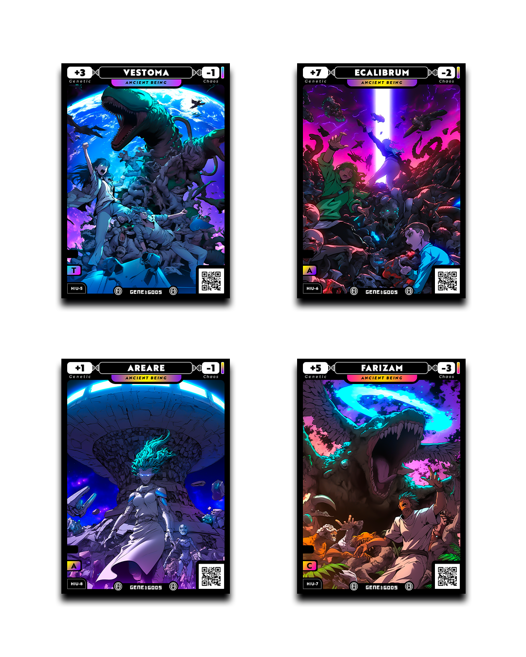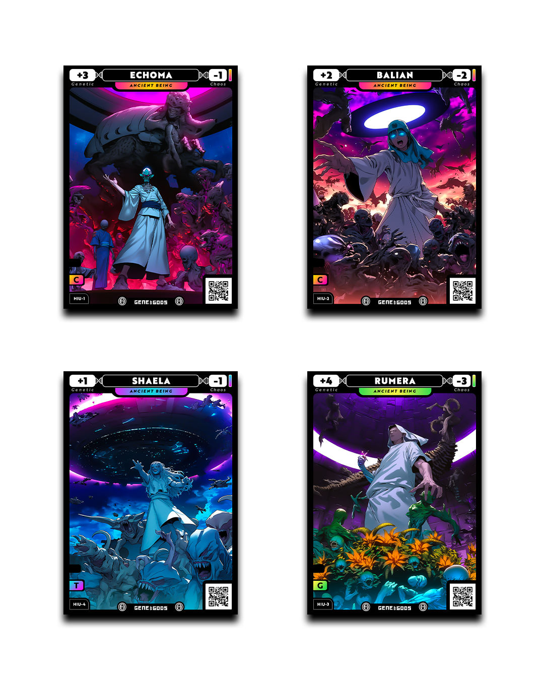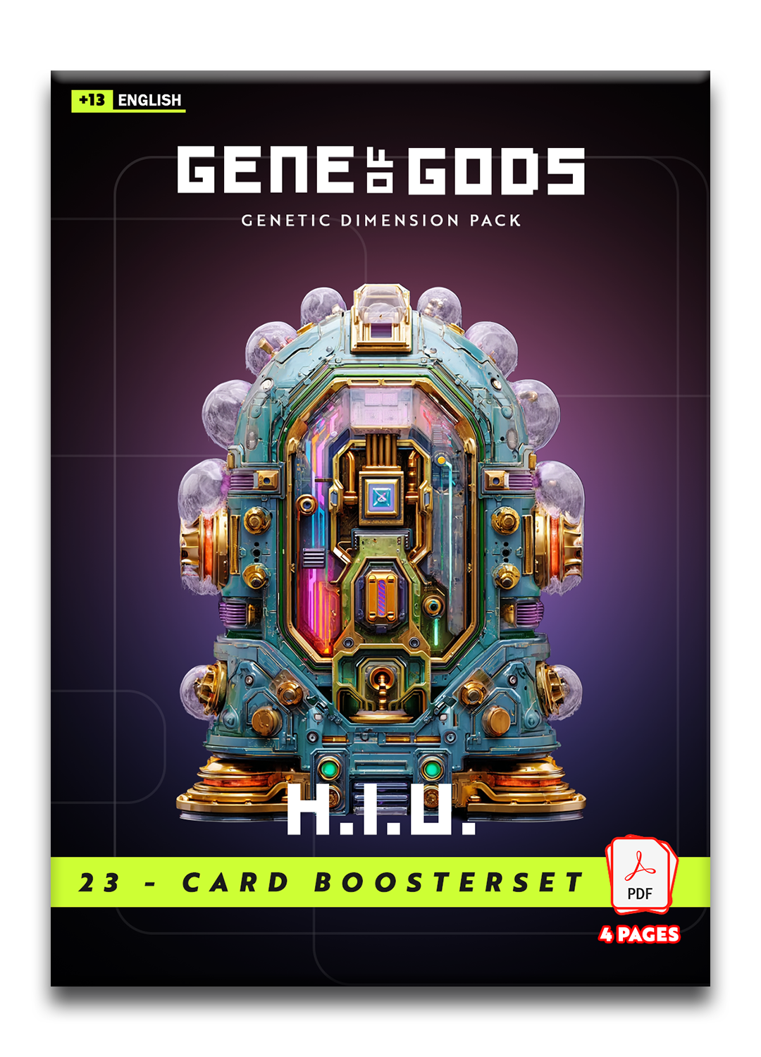 Each GENE OF GODS – Booster Pack contains 21 GENETIC Cards, 2 GENBOOSTER Cards, and an exclusive Short Story Fragment that draws you deeper into the living simulation of GENE OF GODS.