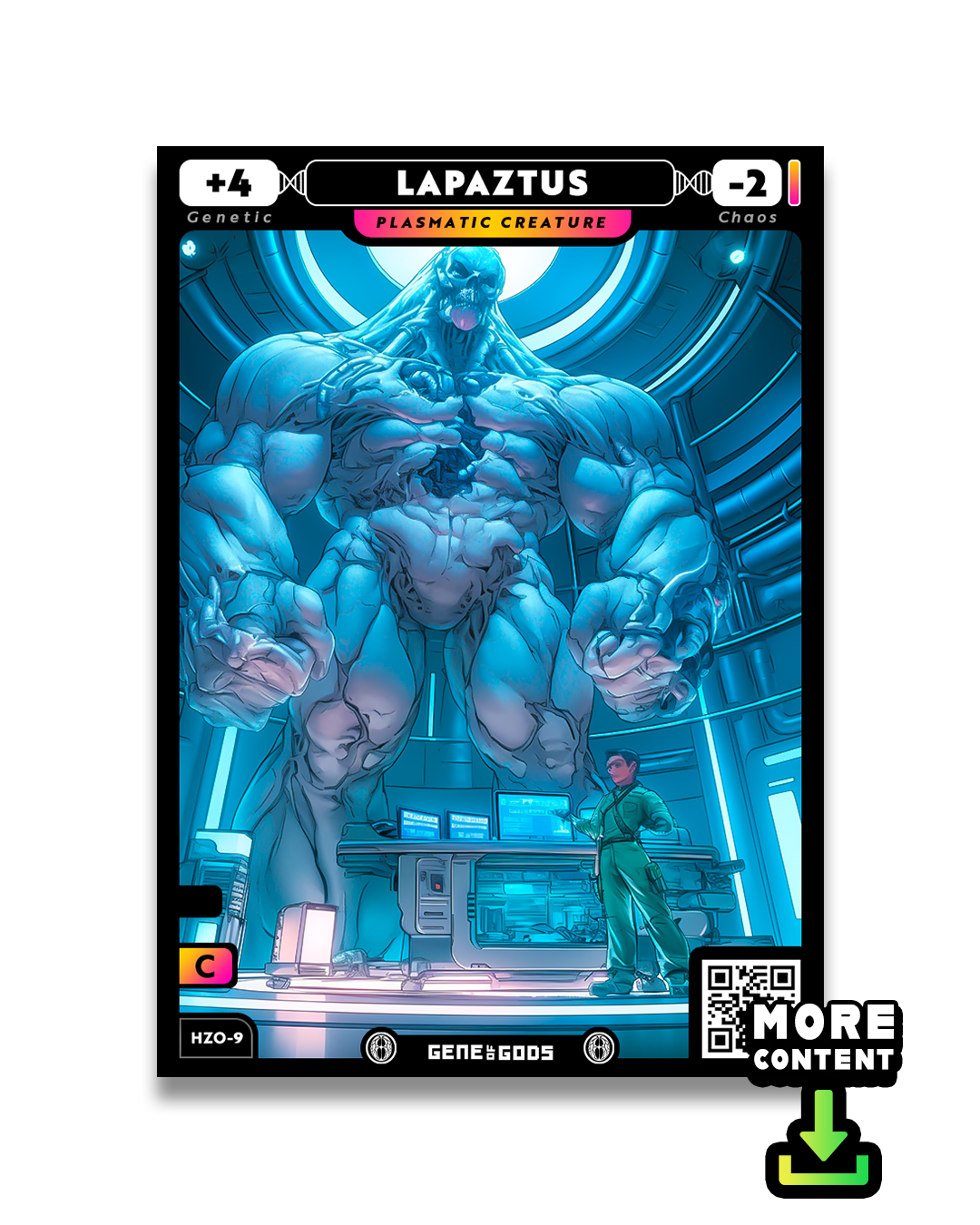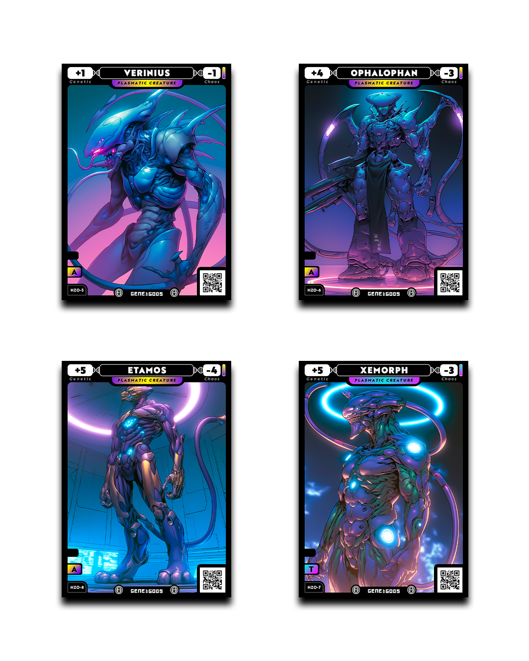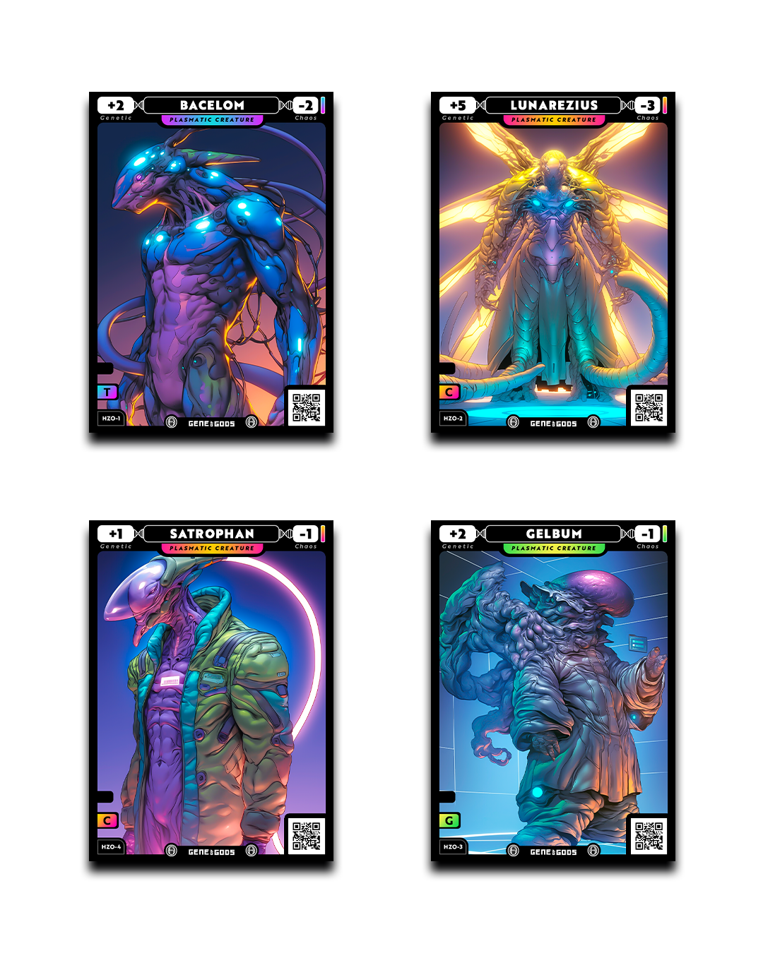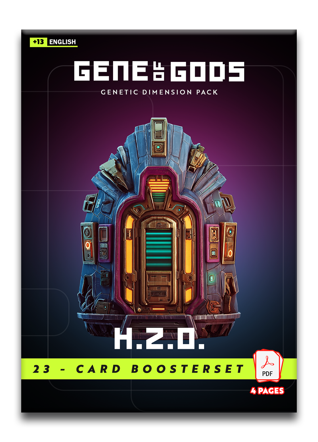 Each GENE OF GODS – Booster Pack contains 21 GENETIC Cards, 2 GENBOOSTER Cards, and an exclusive Short Story Fragment that draws you deeper into the living simulation of GENE OF GODS.